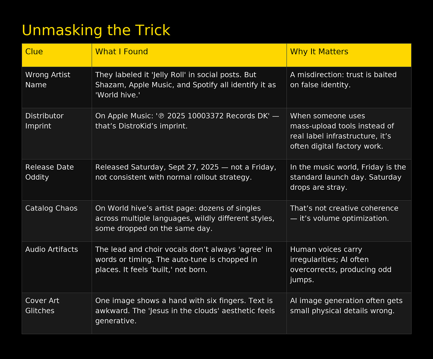 Dozens of singles. Different languages. Wildly different styles. Some even released on the same day. I found way more automation than artistry.